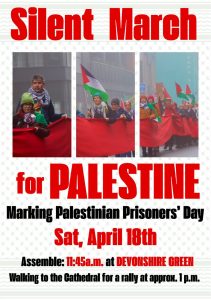 This is a Silent March to mark Palestinian Prisoners Day. Nearly 10,000 Palestinians are held in appalling conditions in Israeli gaols, notorious for extreme forms of torture, sexual abuse and rape, malnutrition and physical and mental violence. Now the Israeli Knesset has just passed a racist law allowing the death penalty for Palestinian prisoners – but it does not apply to Jewish prisoners.