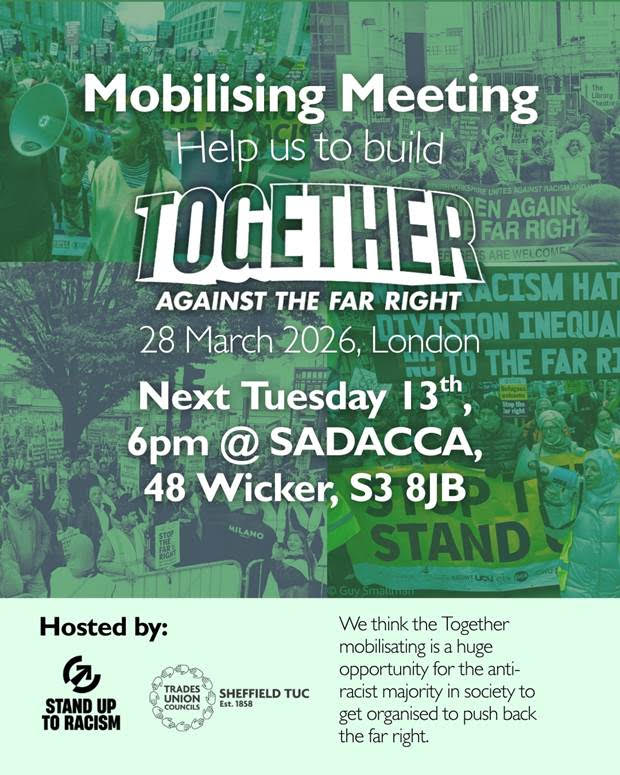 6pm SADACCA The Wicker S3 8JB.    The new year begins with Reform UK top of the polls, far right protests continuing outside hotels and Tommy Robinson announcing a mass mobilisation in May. But this is no time for defeatism. We need to hit the road running to build an anti-racist movement to take them on and turn the tide.  That’s why next Tuesday’s organising meeting for” together against the far right “initiative  hosted by Stand up to racism and Sheffield trades council is so important. The together against the Far right demonstration on Sat 28 March 2026 can be a game changer. It can bring new forces into the anti-fascist movement, build a cultural wing against the far right and give a lift to every anti-racist. It can be an important step in turning the tide against Farage, Robinson and the far right.