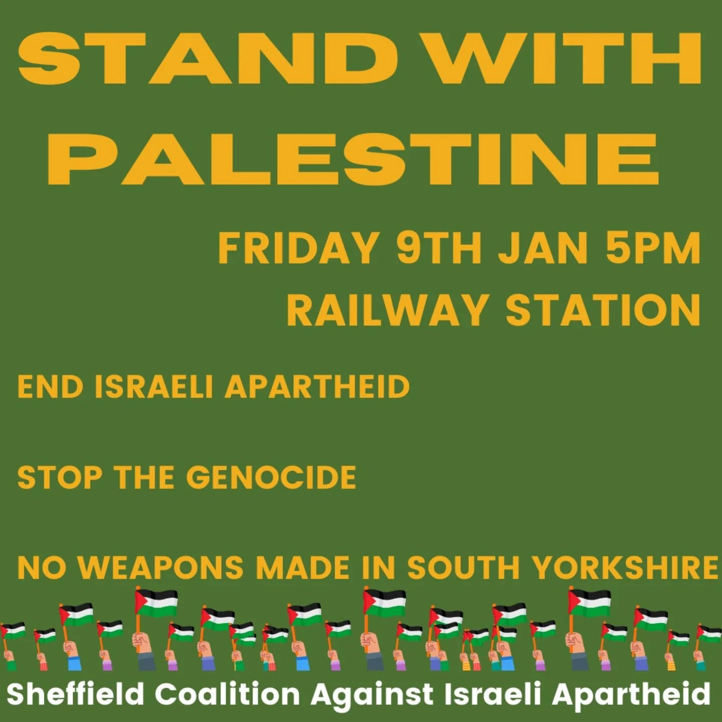 Assemble Mount Pleasant at 1.45pm, departure 2pm. Leaflets for it will be out this week. Some speakers have already confirmed for our Sheffield march for Palestine on 24th January, organised by Sheffield Friends of Palestine. Start spreading the word amongst friends, neighbours, work colleagues and family!