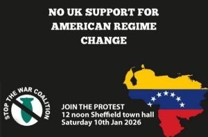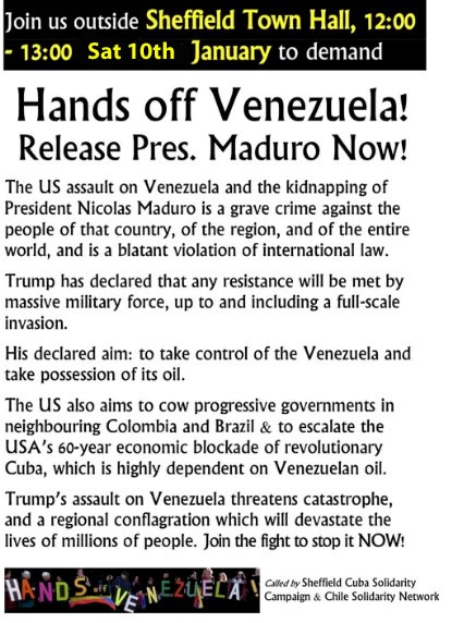 Assemble 12 noon outside Sheffield Town Hall. Come and join us to protest the USA’s illegal military assault on Venezuela and the kidnapping ofi ts President Nicolas Maduro. Trump has all but admitted this was a pretext to seize Venezuelan oil reserves in one of the most blatent neo-colonial interventions by a world power in the 21st Century. It doesn’t stop there: Trump is already threatening to annex Greenland and has also announced his sights are set on Cuba, Colombia and Mexico.  Meanwhile Eiropean leaders like Keir Starmer have stayed silent, preferring not to upset the US President. We demand the UK calls out Trump now and protests this new wave of 21stc USA imperialsim.